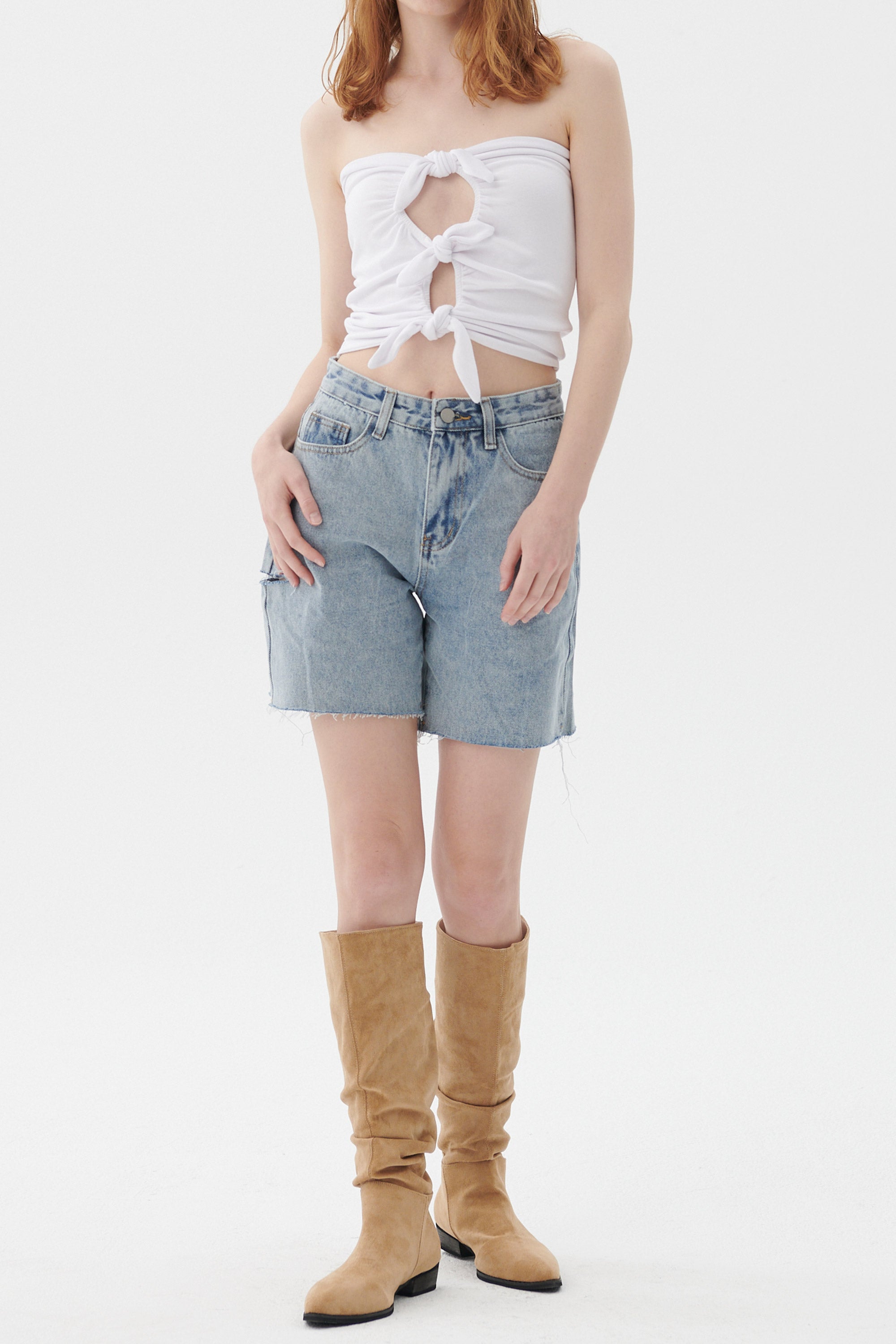 Luna Paperbag Denim Shorts Front zip fly Waist self-tie Loose fit Side cut out detail Raw edge hem Product Specification […]